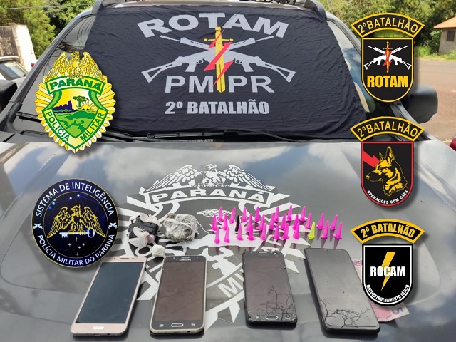 Ainda em Cambará, foi cumprido outro mandado judicial de busca e apreensão numa residência localizada na Rua São Jorge, Bairro São José I, onde 01 indivíduo (35 anos) foi preso e apreendidos 29 pinos (vazios) utilizados para acondicionar cocaína, 01 porção de cocaína, maconha, celulares e dinheiro.