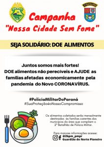 No último dia 07/10 (quarta-feira), o 2º Batalhão de Polícia Militar realizou a quinta e última entrega de alimentos da Campanha “Nossa Cidade Sem Fome”. Ao todo foram 5.460 quilogramas de alimentos destinados às famílias do Norte Pioneiro.