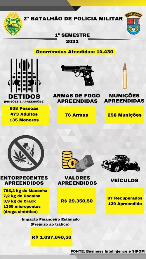 O 2º BPM finalizou os dados referente ao primeiro semestre de 2021. Ao todo foram mais de 14 mil ocorrências atendidas nos vinte e dois municípios do Norte Pioneiro.