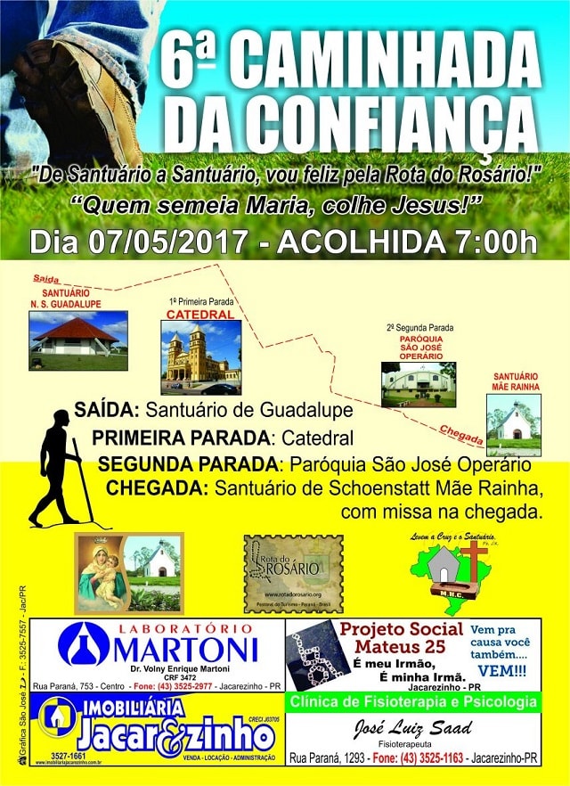 CotidianoJacarezinho 6ª Caminhada da confiança neste domingo dia 07 Por Ademir - 6 de maio de 2017 0 Rota do Rosário de Santuário a santuário, neste domingo dia 07/05 as 07:00
