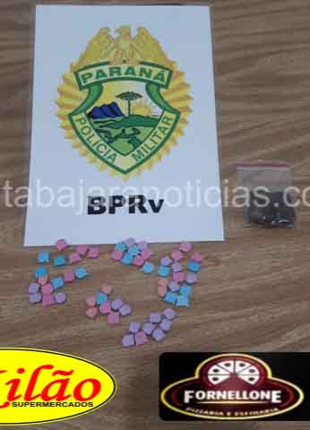 Durante patrulhamento o veículo foi avistado e abordado na Rotatória da PR 412 KM 29+500, após revista nos ocupantes, e nada foi encontrado, porém ao vistoriar o veículo, foi localizado na tampa do compartimento de abastecimento do veículo a quantia de 87 comprimidos de drogas análoga à Ecstasy, e 06 gramas substâncias análoga à maconha.