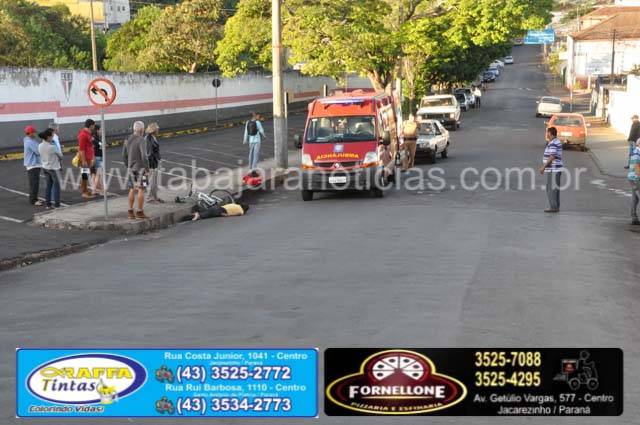 Três pessoas ficaram feridas em um acidente envolvendo uma moto Honda Biz e uma bicicleta no centro de Jacarezinho no final da tarde deste sábado 19.