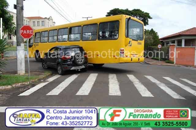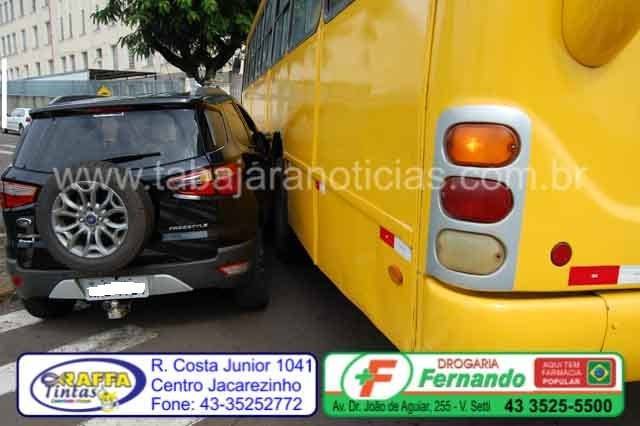 Por volta do meio dia desta sexta 05, um acidente envolvendo um ônibus e uma Ecosport, ambos placas de Jacarezinho, aconteceu no cruzamento da Avenida Getúlio Vargas com a Rua Padre Mello, na esquina do Auto Posto Jacaré l no centro de Jacarezinho.