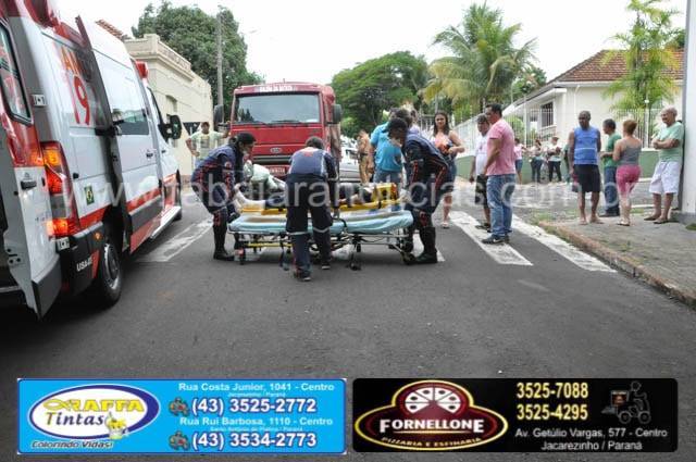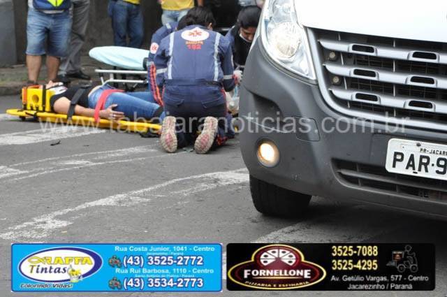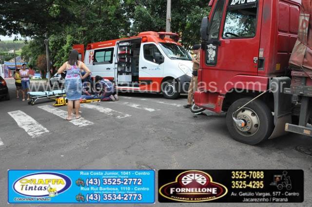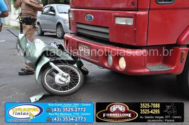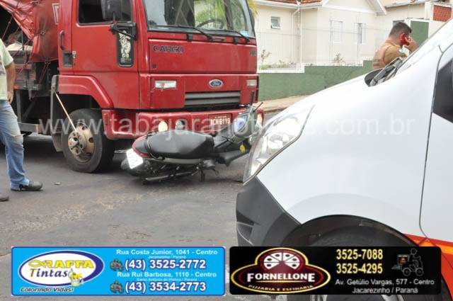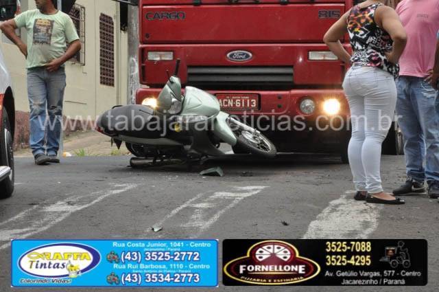 Pouco depois das 14 horas desta quarta 06, uma motociclista ficou feria ao se envolver em um acidente com um caminhão no centro de Jacarezinho.