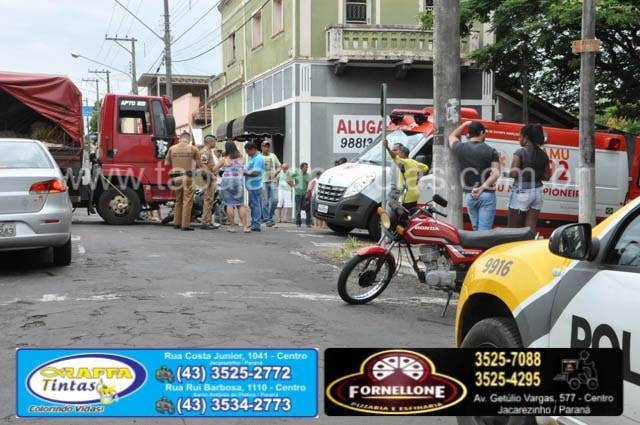 Pouco depois das 14 horas desta quarta 06, uma motociclista ficou feria ao se envolver em um acidente com um caminhão no centro de Jacarezinho.