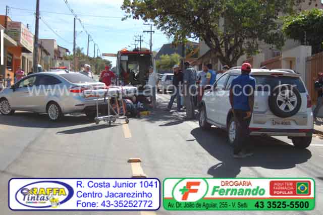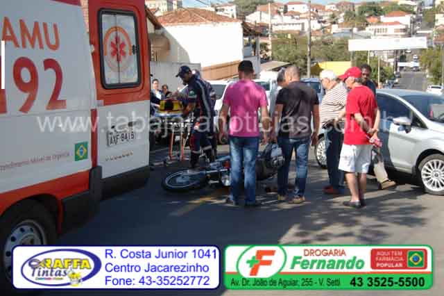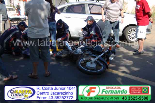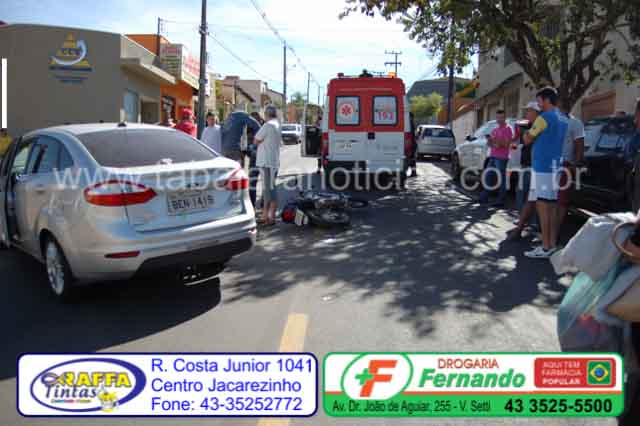 Um motociclista ficou ferido em um acidente registrado no final da manhã deste sábado 15, na alameda Padre Magno, no centro de Jacarezinho, envolvendo uma moto Honda placas de Salto Grande e um Fiesta placas de Jacarezinho.