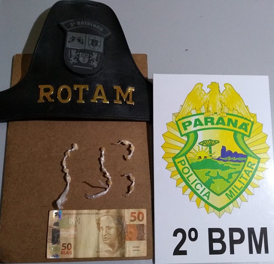 Foi dada voz de abordagem e realizado busca pessoal, sendo que em uma das mulheres (menor de idade), foi localizado no sutiã, 15 (quinze) pedras de substância análoga ao crack, que estavam em forma de terço enrolada em plástico, que pesado em balança não precisa totalizou 0,002 quilogramas e localizado no bolso da calça a quantia de R$ 50,00 (cinquenta reais).