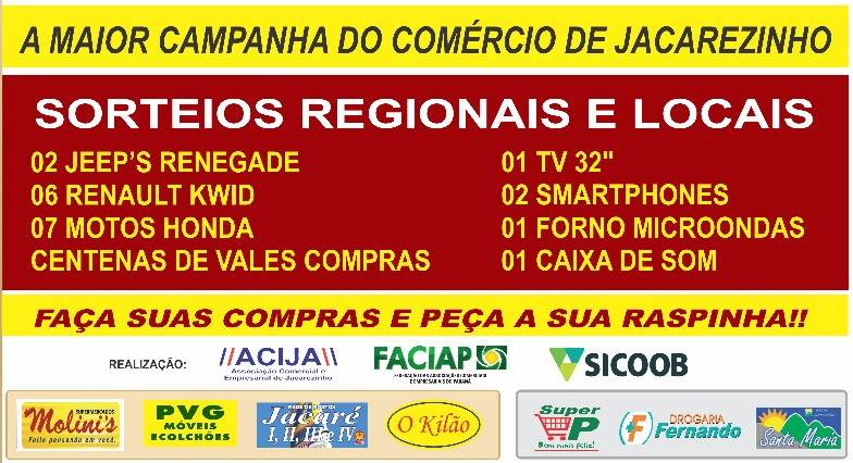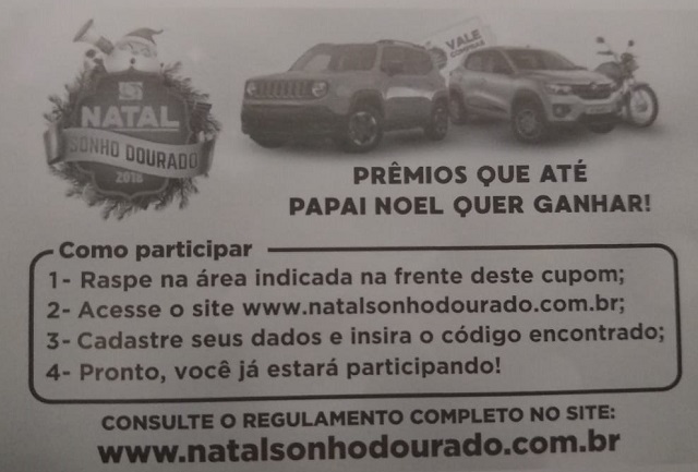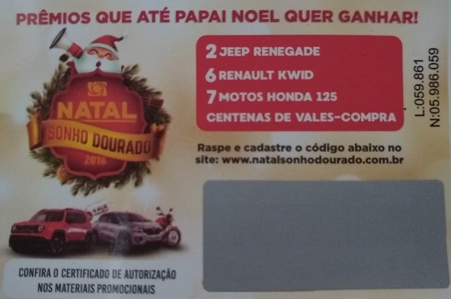 O primeiro sorteio será no dia 17 de novembro, sendo sorteado uma moto Honda, uma TV 32 polegadas e vales compras, ao todo serão 11 sorteios, não fique de fora, nas suas compras peça a sua raspadinha e participe, procure as lojas participantes e participe!!