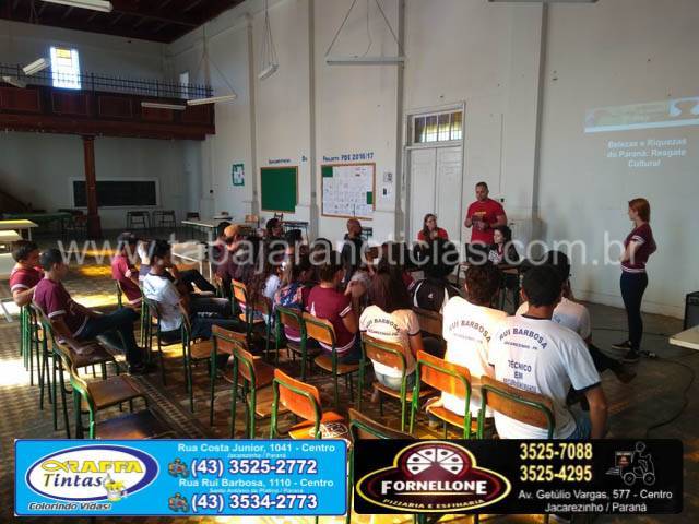 Os alunos do Colégio Estadual Rui Barbosa de Jacarezinho, dos cursos Técnico em Administração e Técnico em Recursos Humanos estão participando da “Caravana da Cidadania”, com o projeto intitulado de “Belezas e Riquezas do Paraná: Resgate Cultural”, o qual possui como objetivo resgatar o “pertencimento” do jovem a cultura local e estadual. Este projeto foi selecionado para representar o núcleo de Jacarezinho que é composto por 12 (doze) municípios.
