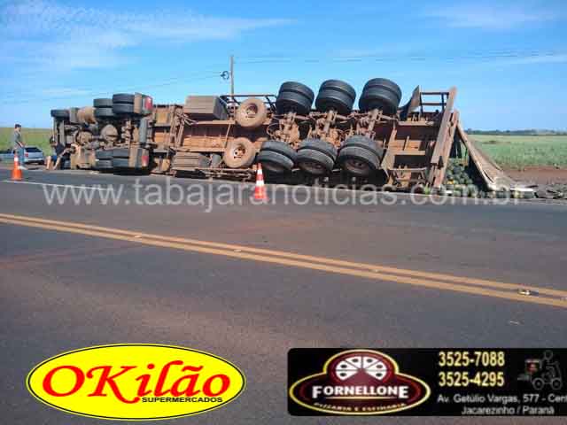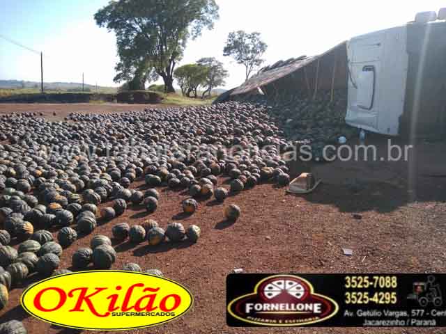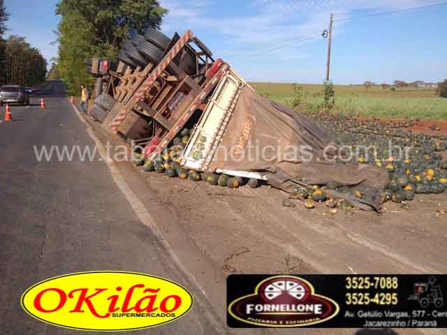 Por volta da 01:00 hs da madrugada desta quarta-feira 13 uma carreta carregada com abóboras acabou tombando na BR-153.