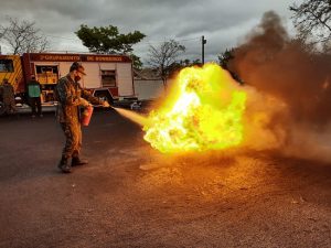 Já a instrução de combate a incêndios abordou temas como princípios de incêndios, medidas preventivas, classes extintoras, ocorrências com GLP, métodos e processos de extinção de incêndio e a utilização dos equipamentos adequados a cada classe de fogo. A instrução foi ministrada pelo Segundo-Sargento Gilson Carlos DA SILVA e Soldado Tiago Augusto BAGGIO.