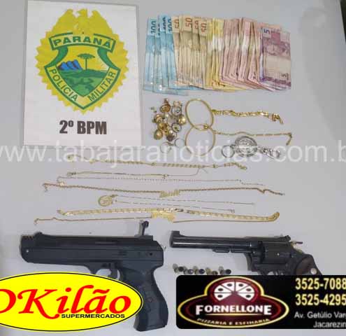 Em seguida foi dada voz de prisão ao individuo (21 anos), onde após realizada revista pessoal foi localizado em seus bolsos um celular samsung duos dourado, uma quantia em dinheiro, bem como varias jóias, sendo o dinheiro e as jóias reconhecido pelas vitimas como produtos roubados de sua residência, e o aparelho celular pertencia ao autor do roubo.