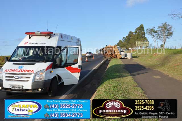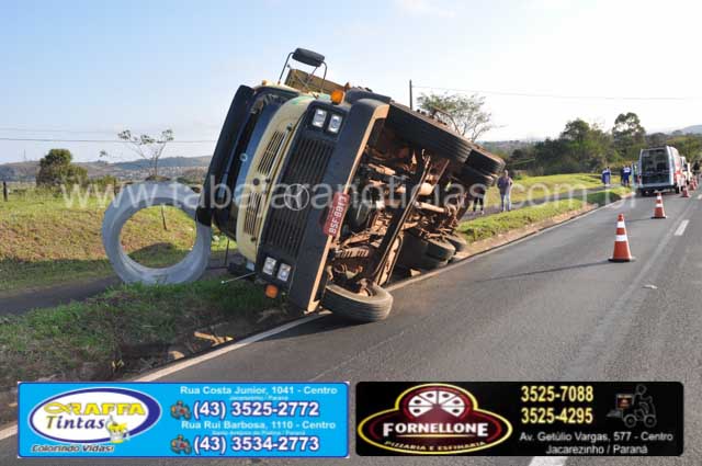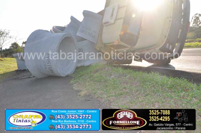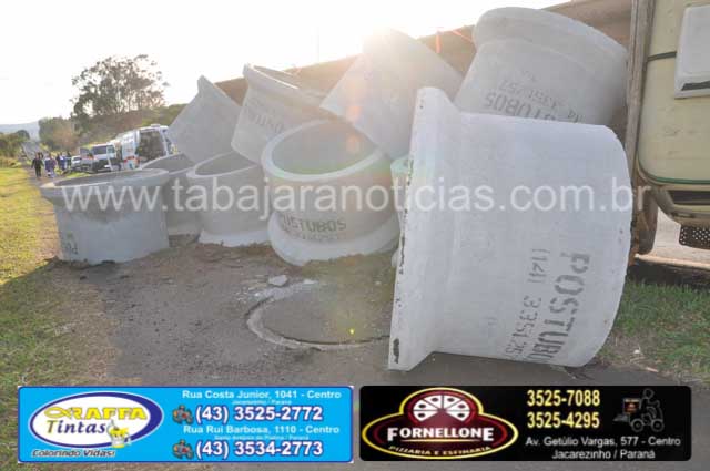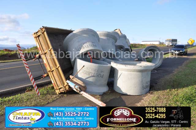A carga de manilhas de cimento pendeu e o veiculo acabou tombando, o motorista não teve ferimentos e parte da carga se espalhou pela pista de caminhada ao lado da rodovia, as equipes de inspeção e socorristas da Econorte estiveram no local, a Policia Rodoviária Federal também esteve presente e tomou as providencias.