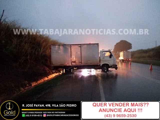 Caminhão derrapa e tomba na BR 153 em Jacarezinho, chovia forte na hora de acidente.