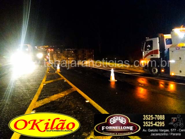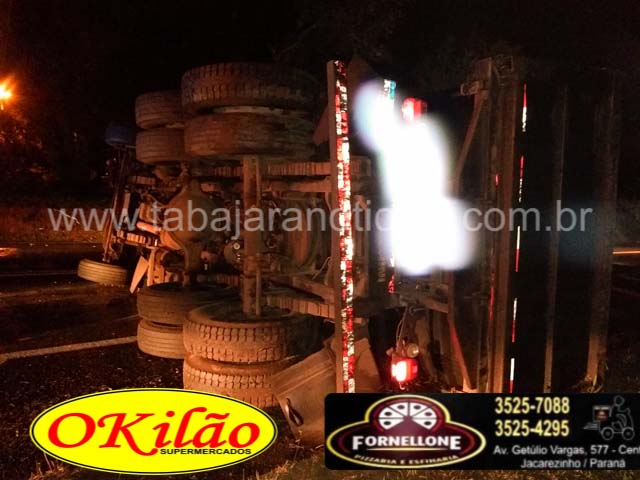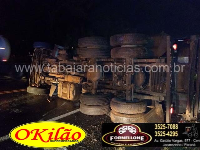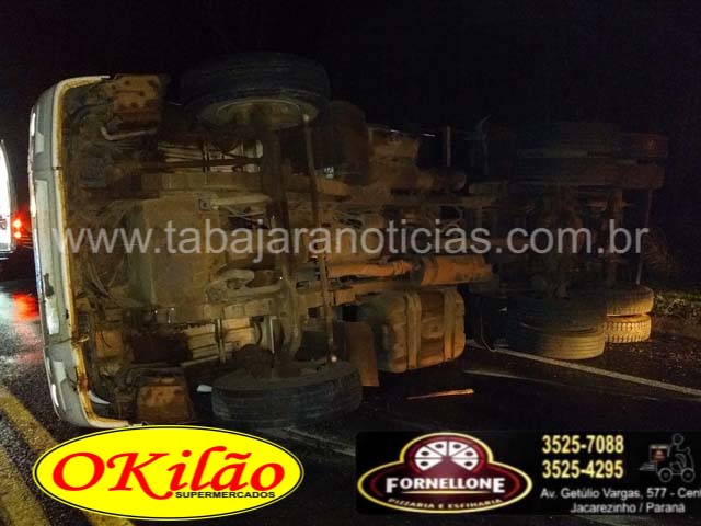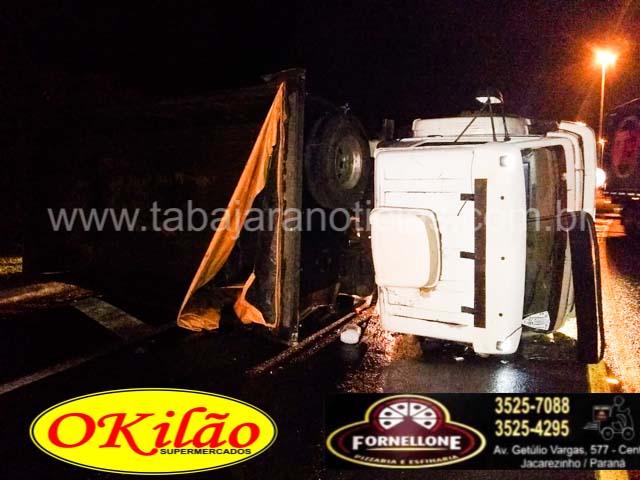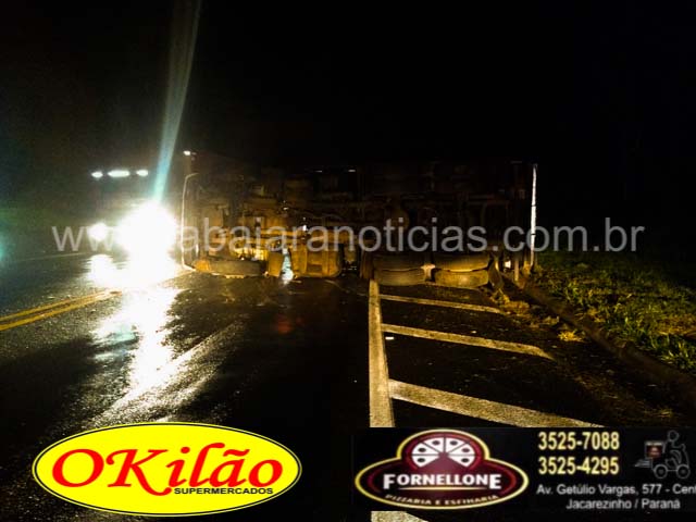 Por volta das 19 horas desta quinta feira 25, um caminhão tombou e interditou parte da BR 153 no trevo do santo entrada de Jacarezinho.
