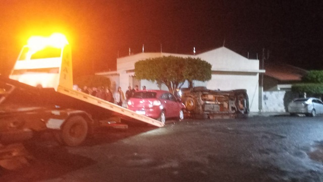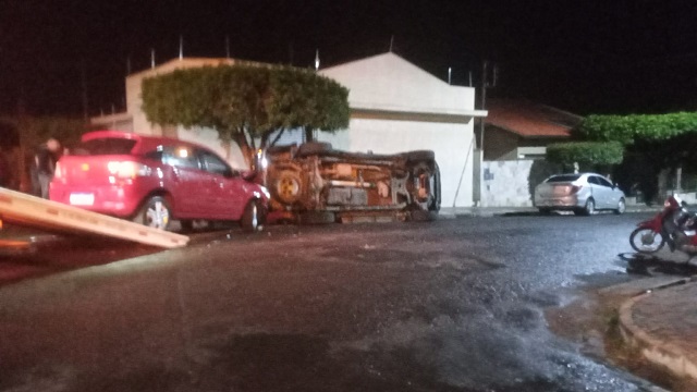 Uma caminhonete Nissan/Frontier tombou após colidir com um Chevrolet Agile na noite desta segunda-feira (5), na área central de Santo Antônio da Platina/PR.