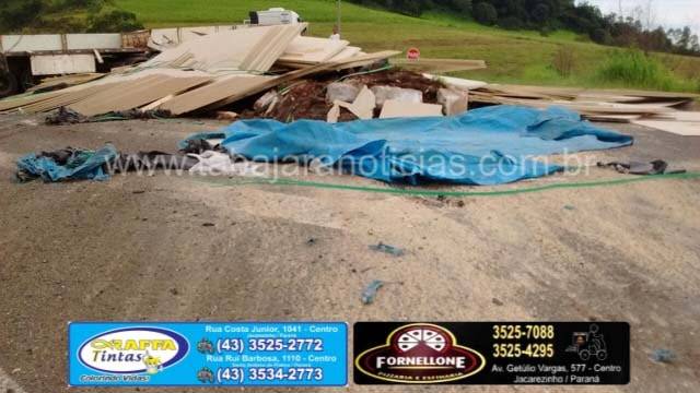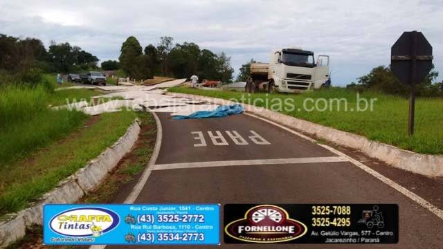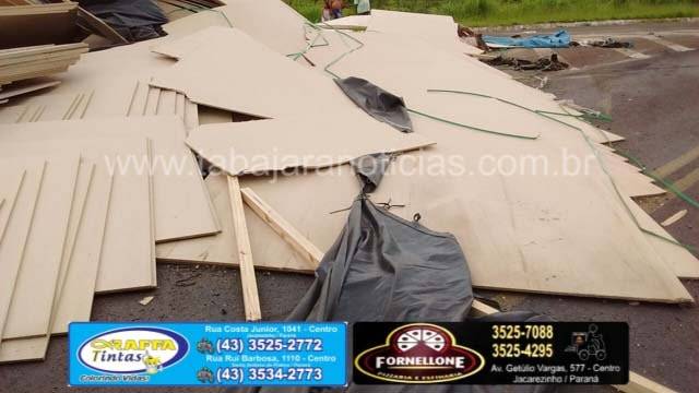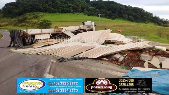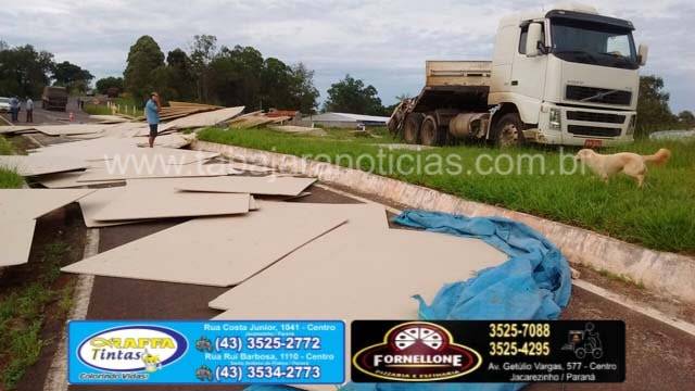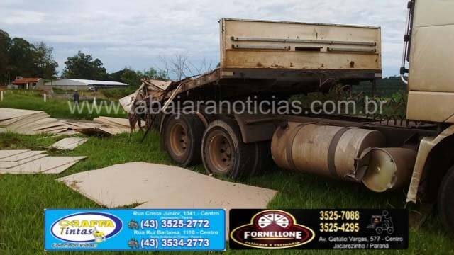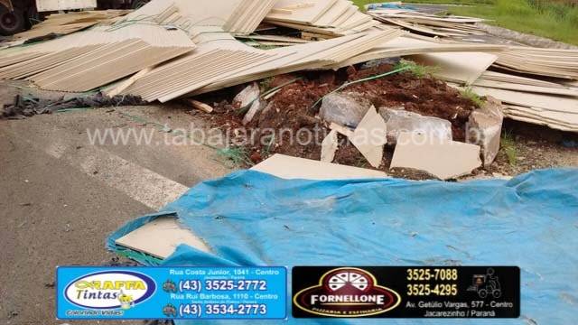 Segundo informou o motorista ele seguia sentido Cambara, quando na curva antes do trevo a ultima carreta saiu no acostamento e a carga de chapas de aglomerados de madeira acabou pendendo, o motorista ainda conseguiu controlar o cavalinho, mas não pode evitar que as carretas tombassem, o conjunto foi se arrastando até baterem no canteiro, com o impacto as carretas destombaram mas a carga ficou espalhada pela pista.