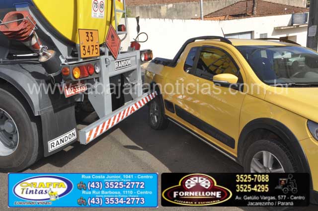 Por volta das 09:40 hs, desta quarta 08, uma carreta acabou se enroscando com uma Saveiro que estava estacionada na rua Don Fernando Tadei no centro de Jacarezinho.