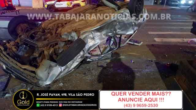 Carro capota após colisão com caminhonete na área central de Bandeirantes