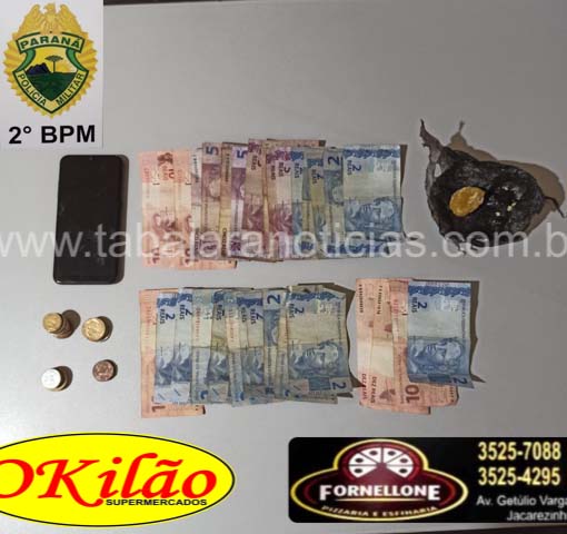 Foi deflagrada abordagem e cerco da casa, sendo encontrada uma porção de crack (fracionada renderia 60 pedras aproximadamente) em cima do sofá, ao lado do suspeito. Também foi encontrado dinheiro, inclusive cédulas e moedas escondidas em baixo da palmilha do tênis dele.