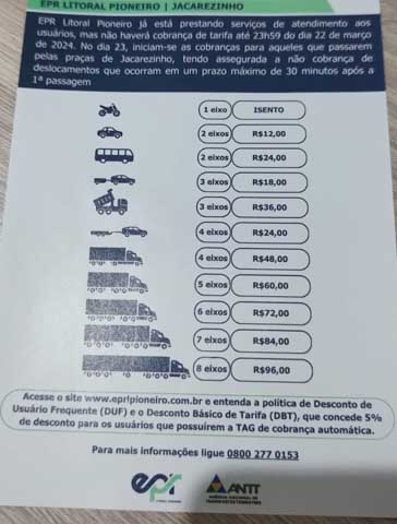 As tarifas para carro de passeio será de R$ 12,00 reais e motos serão isentas da cobrança.
