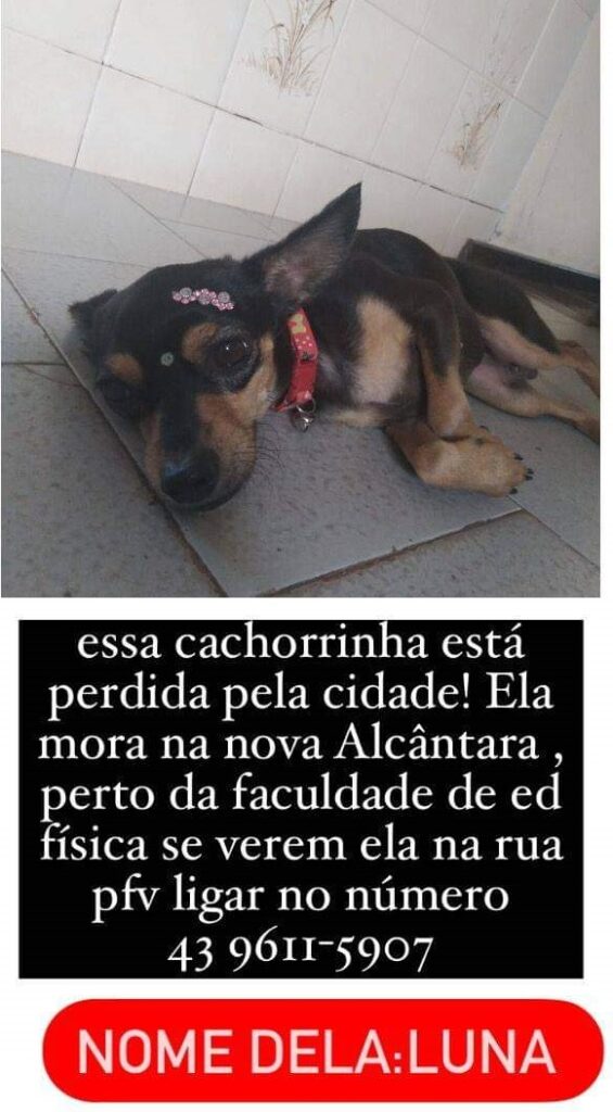 Esta é a Luna, uma cachorrinha que desapareceu no Bairro Nova Alcântara, ela pertence a uma criança que está doente por falta de seu animalzinho, a família está desesperada e pede a ajuda de toda população pra encontrar a luna.