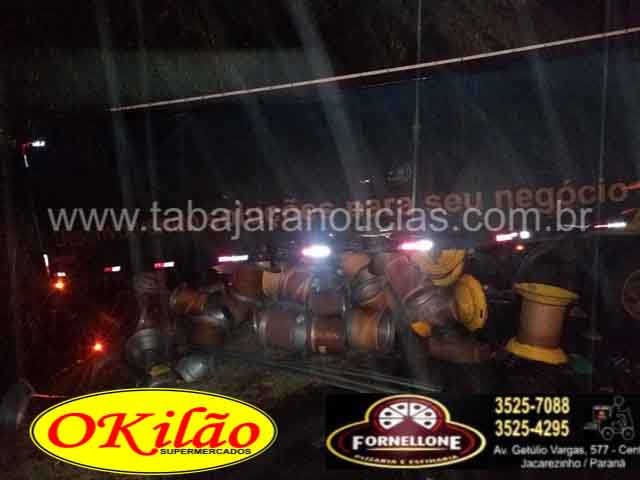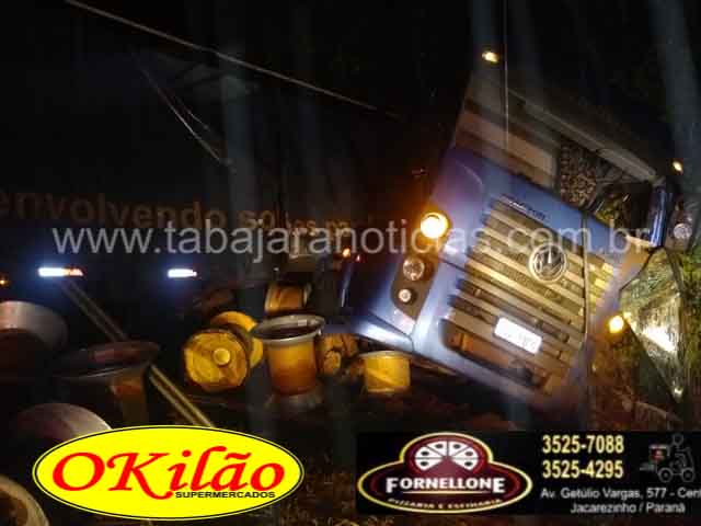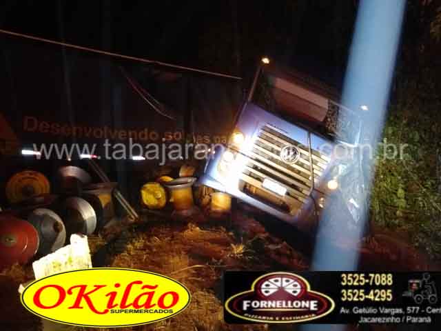 O acidente aconteceu em frente ao alambique, de acordo com as informações a carreta placas de Bauru, seguia sentido Ourinhos quando perdeu o controle ao sair de uma curva, saiu da pista, caiu na canaleta e bateu em um barranco só parando em (L), chovia forte na hora do acidente.