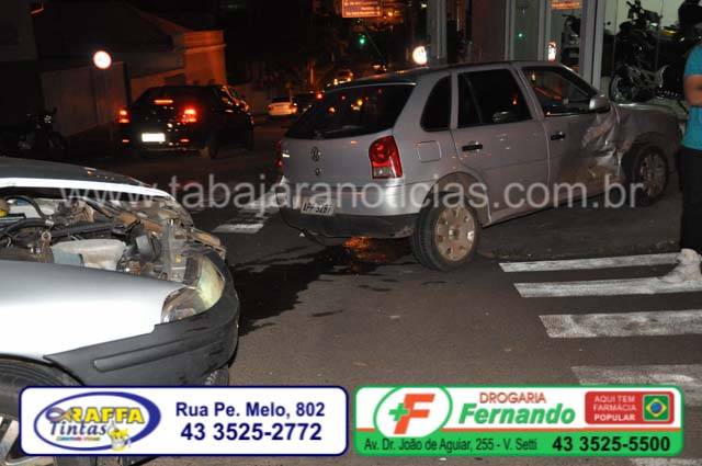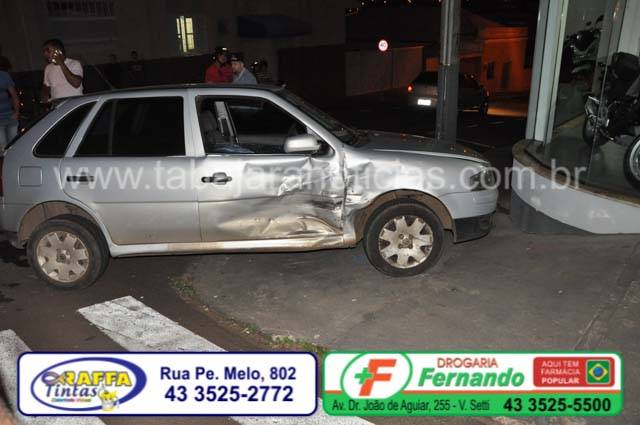 Segundo informações dos condutores o Gol seguia pela Don Fernando quando no cruzamento a Saveiro que descia pela Cel. Batista invadiu a preferencia e acabou colidindo com a lateral do Gol, com o impacto o gol acabou perdendo o controle subiu na calçada e bateu na parede de uma loja de motos existente no local.