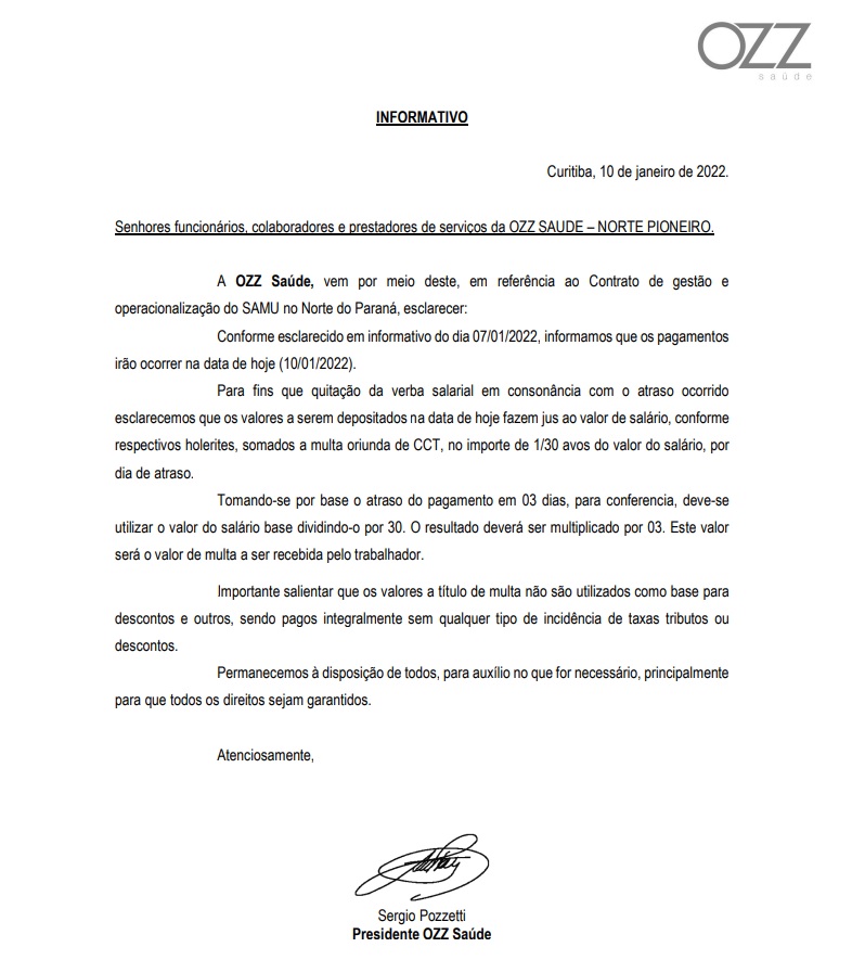 A empresa OZZ Saúde, enviou nesta segunda 10, que os pagamentos de todos os pagamentos dos funcionários do SAMU Norte Pioneiro já estão sendo pagos com todos os juros, multas e correções devidas.