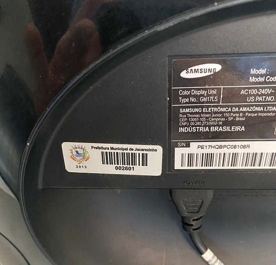 Este monitor Samsung tem a tarjeta de Patrimônio 002601 pertencente à Prefeitura Municipal e que foi posteriormente entregue junto a mesma.