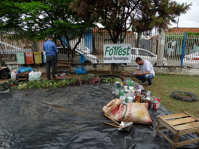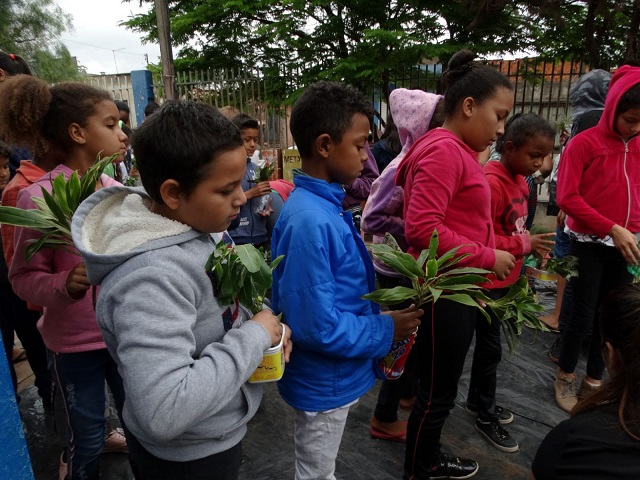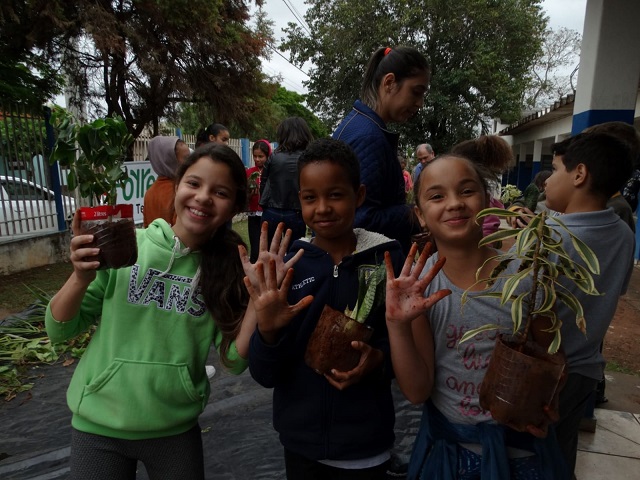 As mudas foram plantadas em ambientes recicláveis como caixas de leite, latas de achocolatado e garrafas pets. Elas levaram as plantas para cuidar em casa e mostrar para os familiares como podem utilizar essas embalagens para o plantio.