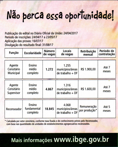 Para maiores informações sobre vagas em seu município clique aqui acesse o site do IBGE.