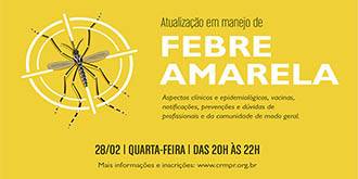 O Conselho Regional de Medicina do Paraná, juntamente com a Secretaria Municipal de Saúde de Curitiba e Secretaria Estadual de Saúde, realizou em 28 de fevereiro, das 20 às 22h, um curso de atualização em manejo de febre amarela. A atividade faz parte do programa de Educação Médica Continuada e poderá ser acompanhada presencialmente, no auditório do CRM-PR, ou pela web. É aberto aos médicos, estudantes de Medicina, profissionais da área de saúde e a sociedade de modo geral.