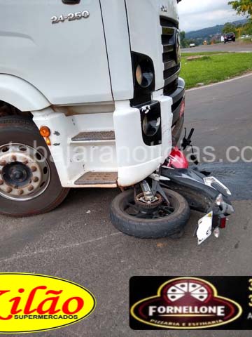 Moto fica em baixo de caminhão em acidente no trevo do Aeroporto em Jacarezinho.