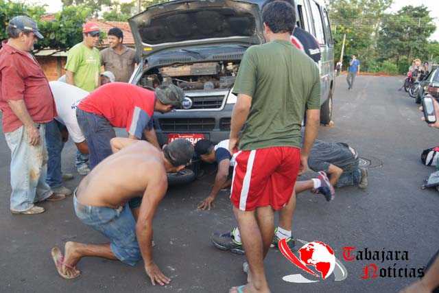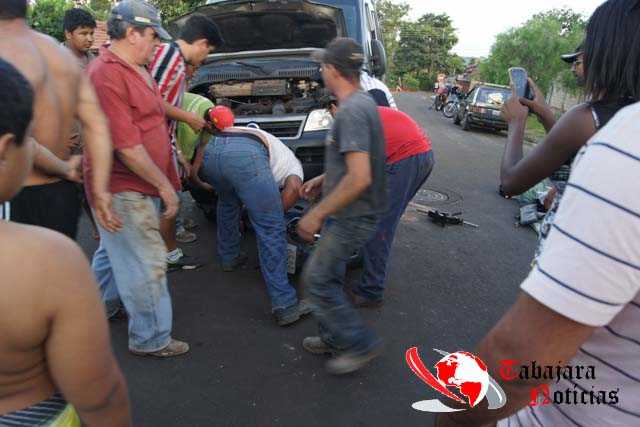 Foi preciso o uso de um macaco e a ajuda de várias pessoas para erguer a van e retirar a moto debaixo dela