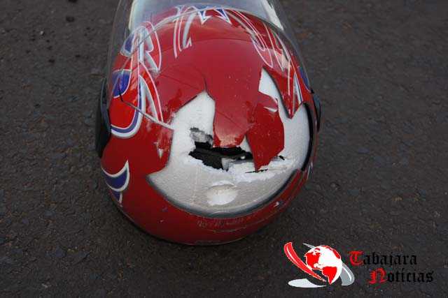 Com o impacto a moto ficou embaixo da van e o seu condutor acabou batendo a cabeça no chão com tanta força que chegou a quebrar seu capacete e o mais incrível é que felizmente ele não teve nenhum ferimento