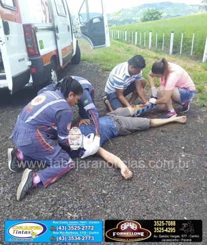 O acidente aconteceu próximo a entrada do sitio Santo Expedito, segundo informações o motociclista seguia pela PR quando sofreu uma queda, O socorrista Jonathan e a enfermeira Janaína, passavam pelo local e deram os primeiros atendimentos e o apoio a equipe do Samu que o encaminhou ao pronto socorro com fratura em uma das pernas, a equipe da Policia Rodoviária Estadual esteve presente e tomou as providencias.