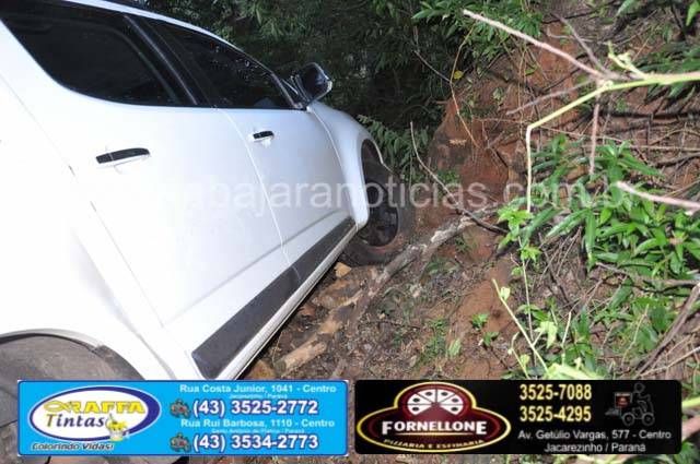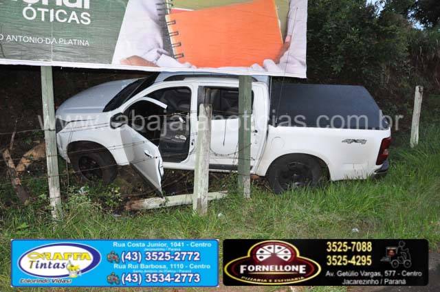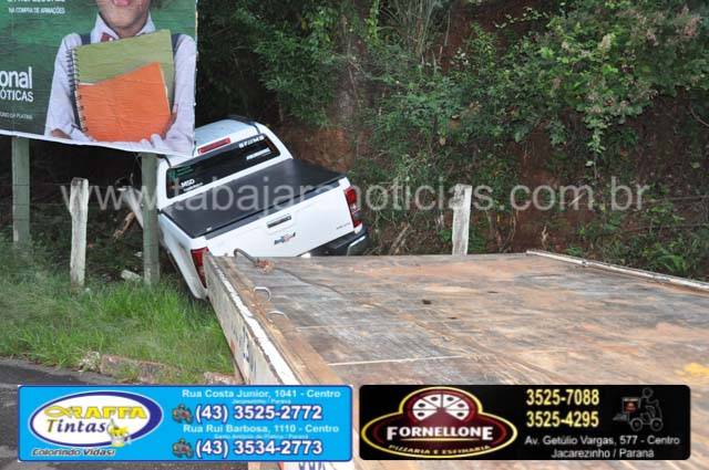 Ao chegar no local a equipe constatou que a caminhonete havia passado direto e não fez a curva batendo no barranco em seguida em uma placa de propaganda, a caminhonete uma S10 placas de Bandeirantes, estava abandonada com toda revirada, com a porta aberta e as chaves no contato, o condutor havia se evadido do local e não se sabe o motivo.