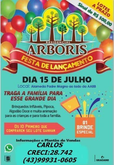 CotidianoJacarezinho Neste sábado 15 festa de lançamento do loteamento ARBORIS Por Ademir - 15 de julho de 2017 0 Festa de lançamento no loteamento, todos estão convidados venham conferir, vendas e informações pelo fone : 43 9931-0605