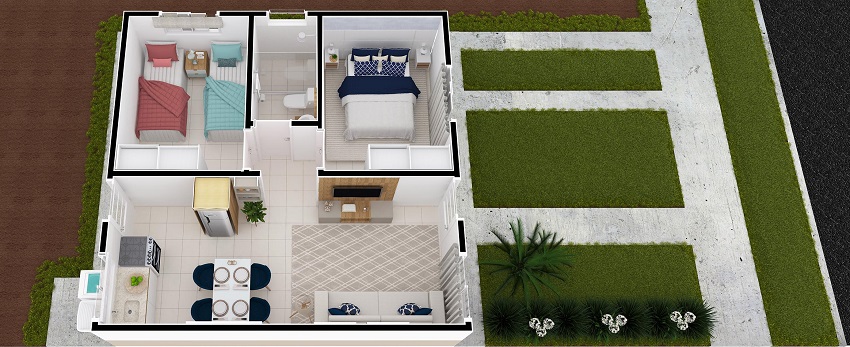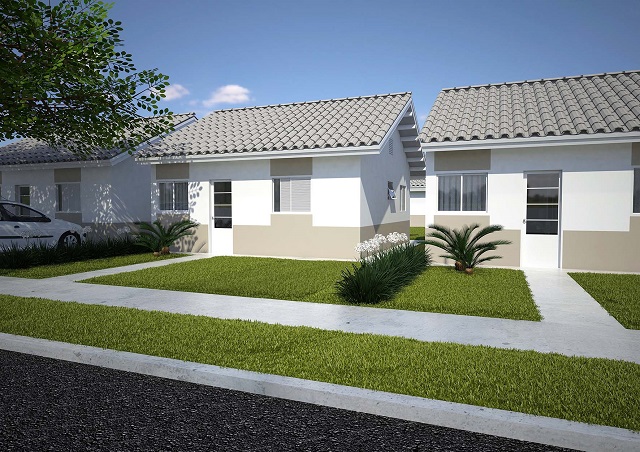 Serão 223 casas térreas de dois dormitórios, sala cozinha e área de serviço coberta, com fácil acesso ao centro comercial.