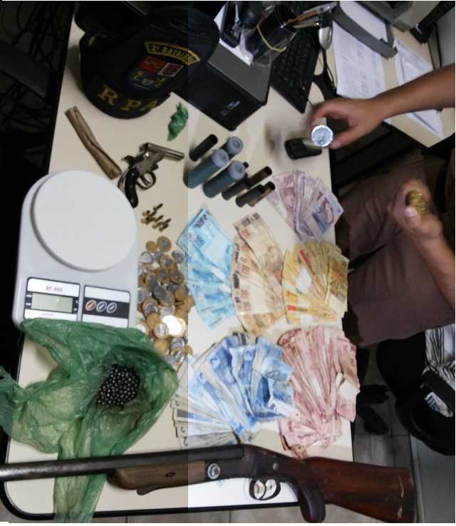 Foram realizadas buscas no interior da residência e localizada uma arma modelo garrucha de dois canos, cal. 22, com 8 munições intactas, e 2 deflagradas, 1 balança de precisão, 1 estojo de DVD com a quantia de 2.278,25 reais em espécie, uma foice de corte de cana, 1 rádio marca Pioneer. As roupas e calçado usados pelo suspeito durante a fuga da equipe policial as quais estavam todas cobertas de lama e uma faca com punho de aço e 18 cm de lâmina.