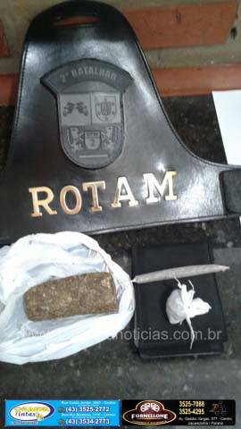 Descrição: Durante patrulhamento na antiga pista de aviação, foi avistado pela equipe ROTAM um veículo celta de cor prata com três indivíduos em atitude suspeita; foi dado voz de abordagem e realizada a revista pessoal, não sendo localizado nada de ilícito com os abordados, porém, durante revista no referido veículo, foi localizado debaixo do tapete do motorista 37 gramas de substâncias entorpecente análoga à maconha, sendo que o responsável pelo veículo informou ser também o “dono” da droga. Diante dos fatos, foram liberados os outros dois envolvidos e encaminhado a droga e seu respectivo “dono” até a Cia PM para confecção do TCIP.