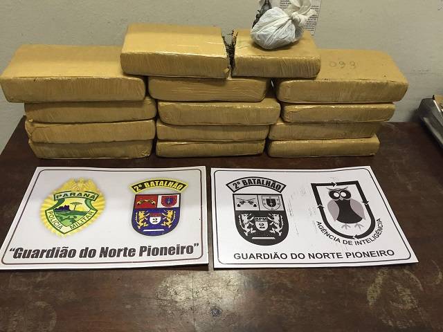 Por volta das 20h30min o suspeito desceu do referido ônibus e foi em direção a um motociclista – 34 anos – que o aguardava. Neste momento, as equipes efetuaram a abordagem em ambos os indivíduos, sendo que com motociclista nada de ilícito foi localizado; entretanto, com o adolescente de Londrina, foi encontrado dentro de sua mochila 14 tabletes de maconha e 1 bucha do mesmo produto, totalizando 10,038 Kg da droga.