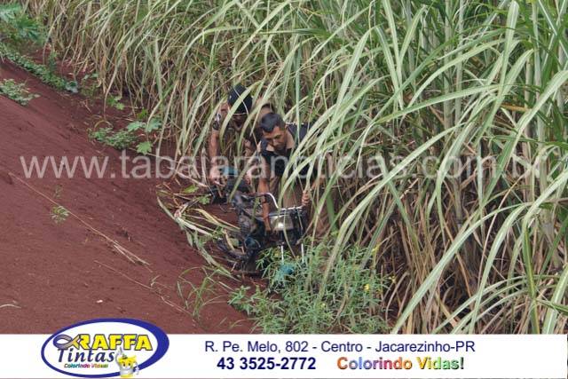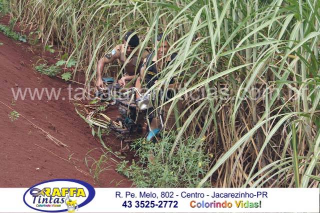 Ao chegarem no local, um canavial em frente a entrada da Fazenda Califórnia as margens da PR 431 os Policiais encontraram a motocicleta CG cor verde placas de Joaquim Távora, que foi furtada no ultimo dia 01 na cidade de Ribeirão Claro, na ocasião do furto a mesma equipe chegou a perseguir os suspeitos do furto com a moto mas eles conseguiram fugir.