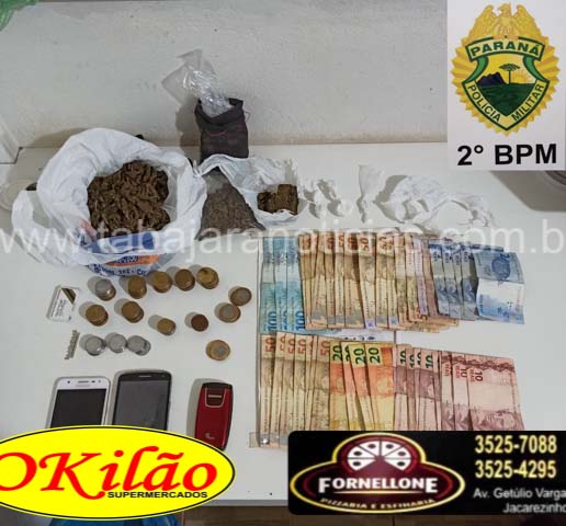 De imediato chegaram as equipes ROTAM e RPA pra dar apoio e na abordagem em revista pessoal foi localizado uma bucha de cocaína em seu bolso, as equipes adentraram na residência para realizar buscas, e no quarto de J., foi localizado três porções maiores de cocaína, uma bucha de cocaína pronta para a venda, 03 celulares, 1498 reais em dinheiro trocado, dentre outros objetos que eram utilizados para a traficância.