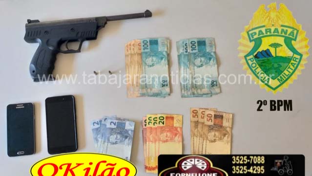 No endereço supracitado a equipe logrou êxito em abordar o referido veículo e localizar em seu interior uma pistola de pressão adaptada para cal. 22 e duas munições de cal. 22. e dinheiro em espécie. O veículo encontrava-se com pendências administrativas e foi recolhido ao pátio do Pelotão PM.