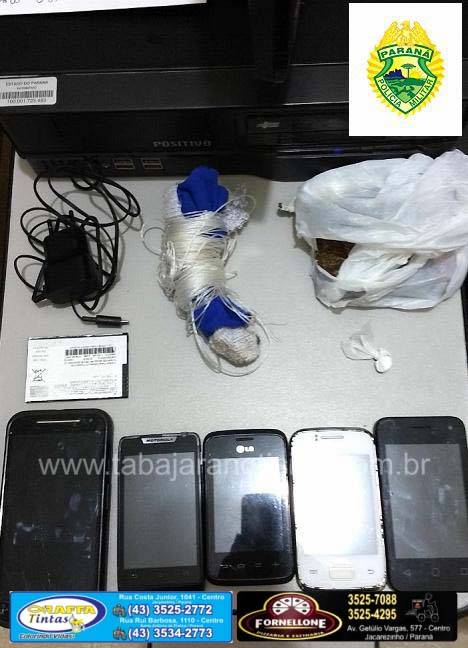 No interior do pacote que o mesmo arremessou na delegacia foi encontrada 133 gramas de maconha, 01 bucha de cocaína, 5 celulares e 1 carregador de celular. Diante dos fatos foi dada voz de prisão ao mesmo e encaminhado até a Delegacia local.