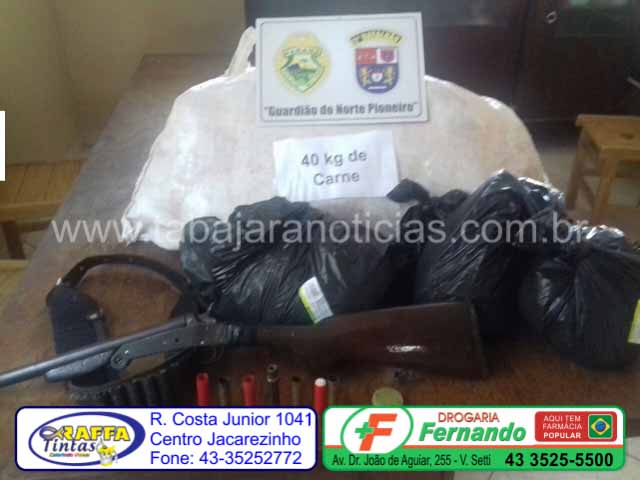 Em posse de informações privilegiadas acerca de um dos autores do crime, os policiais iniciaram as diligências, encontrando a casa do criminoso. No local, a equipe encontrou cerca de 40 quilos de carne bovina, cortadas de forma irregular e ainda com resíduos de gramas, o que indica que possivelmente tenha sido cortada ainda no pasto. Ainda na casa, os PMs apreenderam uma espingarda calibre .32 com 6 munições e um calibrador de cartuchos.