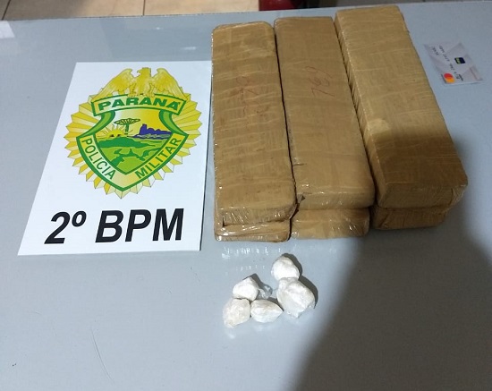 De posse das informações as equipes realizaram a abordagem do carro no trevo da Vila Rural no km 24 da BR 153 em Jacarezinho e encontrado em seu interior, 6 tabletes de maconha, que pesaram 4,070kg da droga, 5 buchas de cocaína, pesando 33g, também foram apreendidos 4 celulares e o veículo Fiat/Palio, um homem (19 anos) e uma mulher (34 anos) foram presos e encaminhados a Delegacia de Polícia Civil pelo crime de tráfico de drogas.