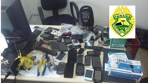 Foram apreendidos 01 (um) revólver calibre 32, 982g (novecentos e oitenta e dois gramas) de maconha, 84 (oitenta e quatro) aparelhos de telefone celular, 10 (dez) facas e 01 (uma) marreta. A arma e a droga foram encontradas com a utilização de um cão do Canil/2ºBPM, treinado especificamente para detecção de drogas e armas de fogo, o qual indicou o local exato onde estava a arma, sendo então, feita a apreensão.